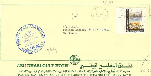 BUSTA CON AFFRANCATURA LOCALE EMIRATI ARABI UNITI, INDIRIZZATA ALLA NOSTRA AMBASCIATA. QUI LA BUSTA E' STATA DATATA E MUNITA DEL BOLLO ROTONDO IN POSSESSO DI DETTO UFFICIO.